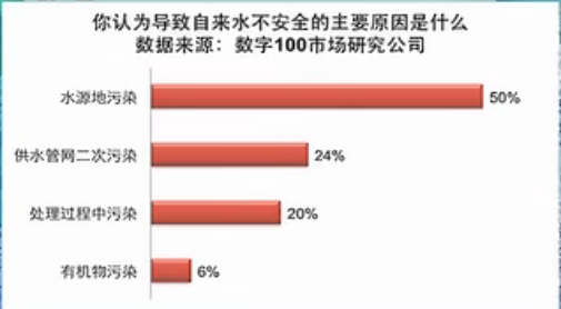 根據(jù)一項調(diào)查自來水主要污染的問題是什么?其中水源地污染占50%,供水管網(wǎng)二次污染和處理中的污染占44%。
