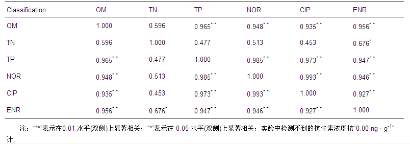 本研究中(表 1和表 2),3種FQs與OM、TP間呈極顯著正相關.S9點位OM含量最高,沉積物中的OM蘊含物質復雜多元,F(xiàn)Qs進入水體后會迅速被吸附,因此S9點位測得的3種FQs也最高,這與張勁強等的研究也相符合.Carrasquillo認為FQs有很強烈的吸附固相,能夠強烈吸附在顆粒物和沉積物中(Carrasquillo et al., 2008),可見FQs與沉積物間的相互吸附作用強烈,也可以解釋FQs在沉積物中含量高的原因.