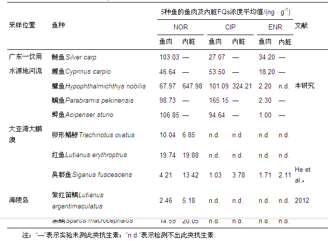 本研究測得5種魚的魚肉中的FQs含量均顯著高于大亞灣大鵬澳和海陵島中魚的FQs的含量;部分魚類魚肉和內臟中NOR、CIP含量高于美國、歐盟的許多國家的殘留標準(殘留限量為30 ng · g-1),也高于我國農(nóng)業(yè)部標準NY 5070—2001《無公害食品水產(chǎn)品中漁藥殘留限量》的殘留標準(NOR、CIP殘留限量為50 ng · g-1).分析原因乃為同上,主要是養(yǎng)殖魚塘、禽畜養(yǎng)殖業(yè)、城鎮(zhèn)生活污水及感潮河流的滯留效應,導致面源污染嚴重,水體中可能含有較高的FQs含量.Li的研究表明FQs在可食用的軟體動物內臟中性質穩(wěn)定(Li et al., 2012);孫言春的研究也表明FQs在魚體內吸收較快,消除較慢,F(xiàn)Qs在魚體內富集作用較強.魚內臟部位為代謝器官,因此,更易積累,造成魚內臟中抗生素含量較高的現(xiàn)象.魚體內臟中FQs含量多數(shù)情況下高于魚肉中FQs含量,這個結果與He的研究結果一致.