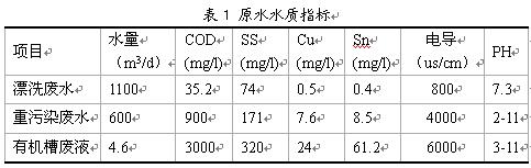 某電子公司是國(guó)內(nèi)重點(diǎn)集成電路封裝測(cè)試企業(yè),該公司主要從事半導(dǎo)體集成電路、半導(dǎo)體元器件的封裝測(cè)試業(yè)務(wù),其生產(chǎn)線廢水主要包括兩部分,一部分為晶元的減薄劃片廢水、另一部分為電鍍錫化廢水。減薄劃片廢水中主要含有大量的硅粉微粒,SS約2000mg/L左右,特性很穩(wěn)定,不易沉降,電導(dǎo)率僅為2-4µs/cm,東洋采用自主研發(fā)的二級(jí)連續(xù)UF膜系統(tǒng)進(jìn)行進(jìn)行廢水回收利用,廢水回收利用率≥90%,回收水質(zhì)好,同時(shí)回收硅粉。在此主要介紹電鍍錫化廢水的回用處理系統(tǒng);廢水中主要含有Cu、Sn、酸堿、有機(jī)物等,在該項(xiàng)目中首先要做好分質(zhì)分流是尤為重要,把錫化電鍍線上的廢水按照水中的成份及濃度來(lái)分質(zhì)收集,主要分為漂洗廢水、重污染廢水、有機(jī)槽廢液三路,水質(zhì)如下: