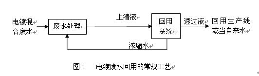 圖1是把所有電鍍廢水混合集中收集,先經(jīng)過(guò)物化或生物一系統(tǒng)處理,然后把上清液進(jìn)行膜系統(tǒng)回收,因在廢水處理過(guò)程中,投加了大量的PAC、PAM等,藥劑中含有大量的陽(yáng)離子物質(zhì)存在水中,很容易與回用膜元件表面電荷結(jié)合而堵塞膜元件,更不能保證很高的回收率,通常回收率最高僅能達(dá)到50%,往往并不能保證長(zhǎng)期穩(wěn)定的運(yùn)行;因投加了大量的藥劑,使廢水的含鹽量也大大的增加,所以也降低了回用水水質(zhì);通過(guò)膜技術(shù)回用后的濃縮水重金屬通常會(huì)超標(biāo),不能直接排放,這樣只能回到廢水前處理系統(tǒng)中,從而增加了廢水處理部分的負(fù)荷及水量,嚴(yán)重影響廢水處理部分的效果,同時(shí)占地及土建投資也增大。