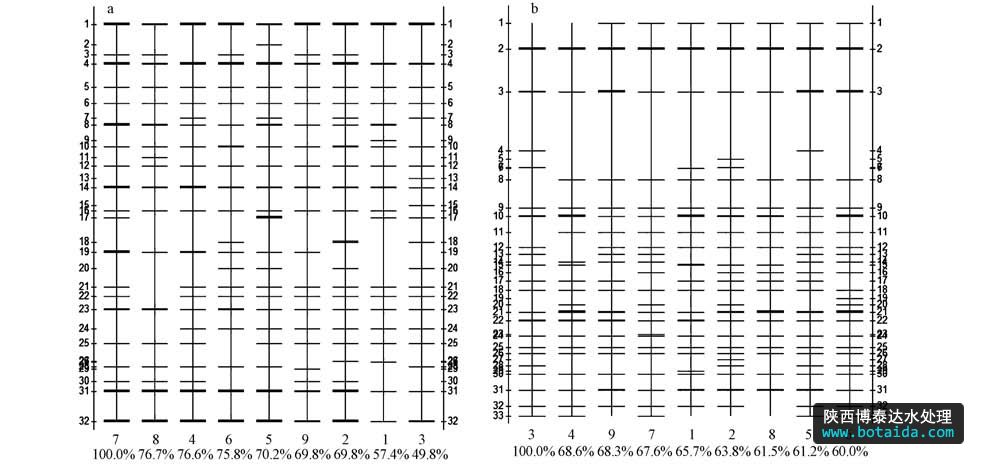 圖3 大亞灣海域浮游細菌16S rDNA V3區(qū)DGGE圖譜分析帶型圖(其中水平軸上的數(shù)字(1~9)為站點編號,百分比是與標準泳道的匹配度; 垂直軸上的數(shù)字為DNA條帶編號(a. 2010年冬,b. 2011年夏))