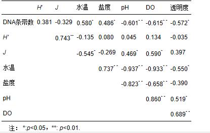 從浮游細菌與環(huán)境因子之間的相關(guān)關(guān)系可以看出,DNA指紋條帶數(shù)與環(huán)境因子密切相關(guān),其中與溫度和鹽度明顯正相關(guān)(p<0.05),而與pH、DO以及透明度明顯負相關(guān)(p<0.05或p<0.01),結(jié)果說明高溫高鹽可促進浮游細菌多樣性,而pH、DO、透明度下降等水質(zhì)惡化現(xiàn)象則可降低浮游細菌的種類豐富程度.H′值僅與J值呈明顯正相關(guān);而J則與水溫明顯負相關(guān),與pH和DO明顯正相關(guān).各種環(huán)境因子之間幾乎均呈現(xiàn)出明顯的相關(guān)關(guān)系,其中水溫與pH、DO、透明度均明顯負相關(guān)(p<0.05或p<0.01),說明夏季水質(zhì)較冬季差;而DO又與pH和透明度明顯正相關(guān)(p<0.01).