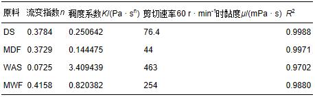根據式(2),測定不同轉速條件下的原料黏度,由冪律方程擬合得到4種發(fā)酵原料的流變特性參數,如表 1所示.流變指數n是衡量實際流體與牛頓流體相似程度的指標.當n為1時,此時流體為牛頓流體;n小于1時,流體為假塑性或者剪切變稀流體;n大于1時,流體為膨脹塑性或者剪切增稠流體.從表 1中可以看出,4種原料的流變指數n都小于1,在 TS 為 5%、溫度為35 ℃條件下都為假塑性流體(陳志平等,2004).造成這4種原料呈現明顯的假塑性流體性質的原因可能是污泥主要由微生物聚集體(即活性污泥菌膠團)、廢水帶入的無機性沉渣、少量未降的有機物等大分子物質和大量的水分組成,污泥混合液中大分子物質的存在會使原料在受到剪切后發(fā)生分子的重排,分子趨向與流動方向一致,流動阻力下降,從而使表觀黏度在剪切速率增大時減小(劉刈等,2009).4種原料中WAS的流變指數最小,剩餐的最大,這說明在 TS 為 5%、溫度為35 ℃條件下4種原料中MWF的流變性質最接近牛頓流體,而WAS偏離牛頓流體的程度最大.此外,4種原料中MDF的黏度最小,WAS的黏度最大,而流體稠度系數作為黏度的量度,使得通過擬合的得到的4種原料的流體稠度系數中MDF最小,WAS最大.