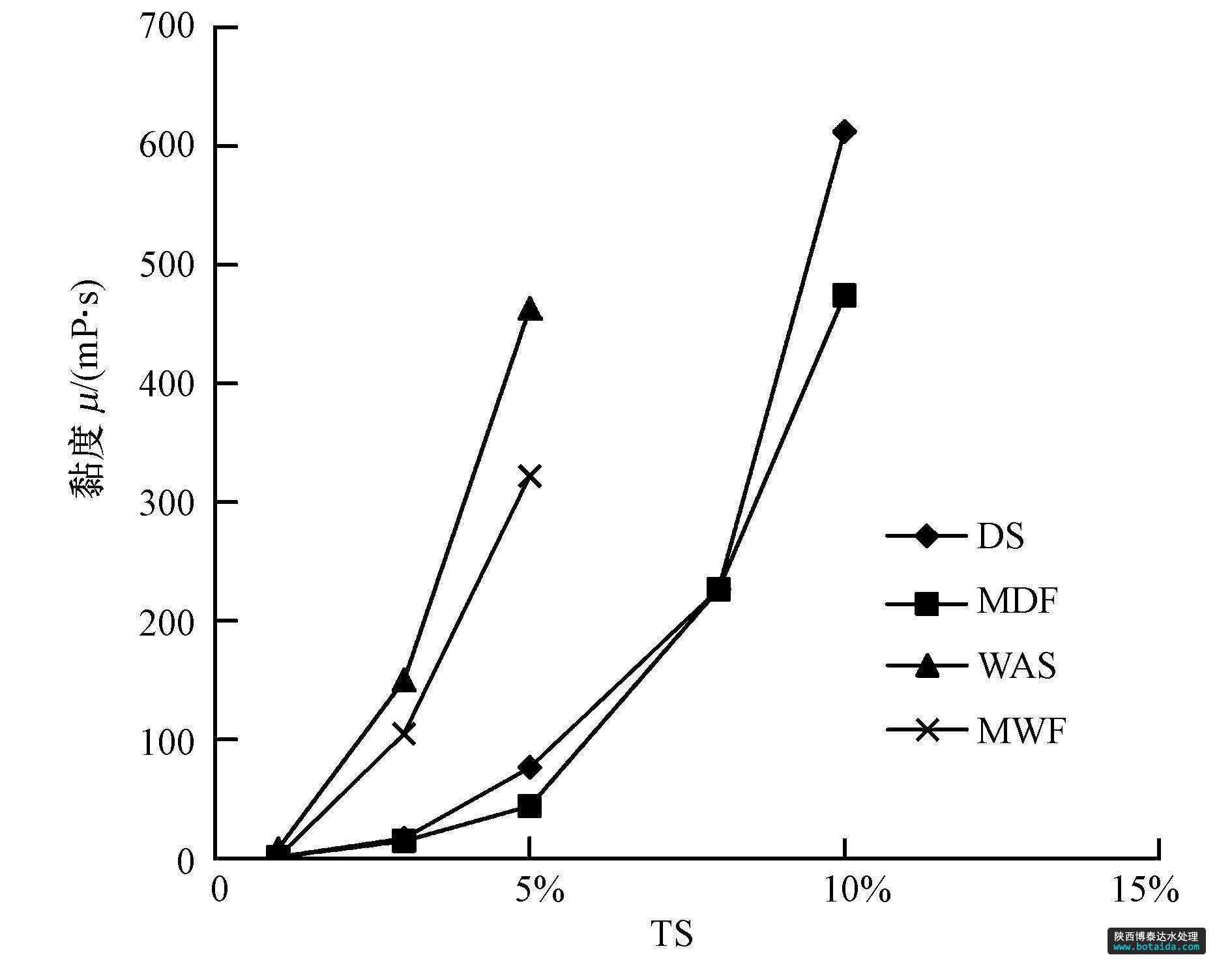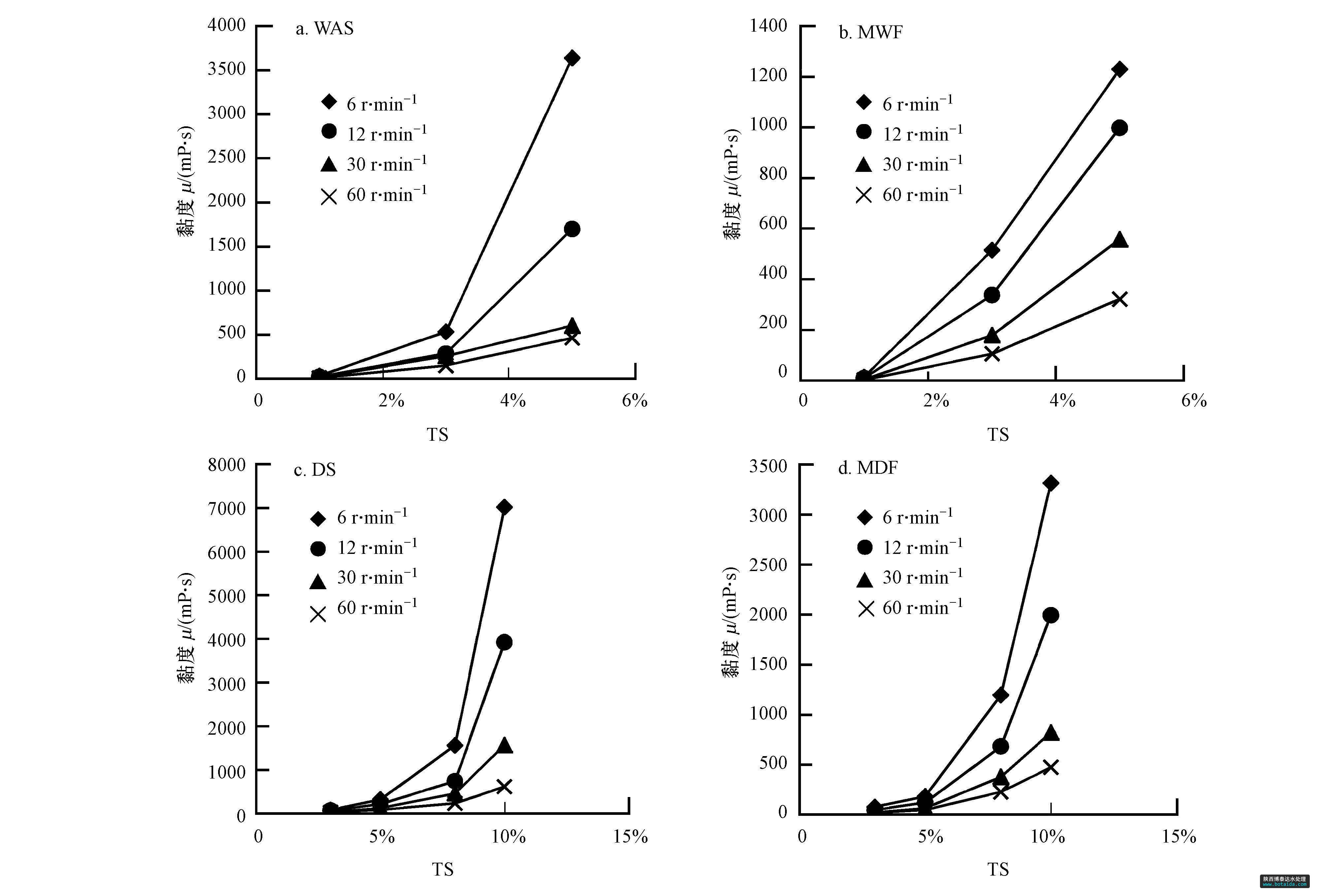根據原料的起始 TS濃度,用蒸餾水分別將DS、DS與餐廚垃圾按TS 4 ∶ 1混合的混合物(the mixture of dewatered sludge and food waste,以下簡稱MDF)配制成TS濃度分別為1%、3%、5%、8%和10%的混合液裝于500 mL 燒杯中;用恒溫水浴鍋控制混合液溫度為35 ℃,樣品經過攪拌之后,用旋轉黏度計(NDJ5-S,中國上海)測量 4 個攪拌轉速(6、12、30、60 r · min-1)下的黏度,待讀數基本穩(wěn)定時,每10 s 讀數1次,共讀取7個黏度值,取算術平均值.