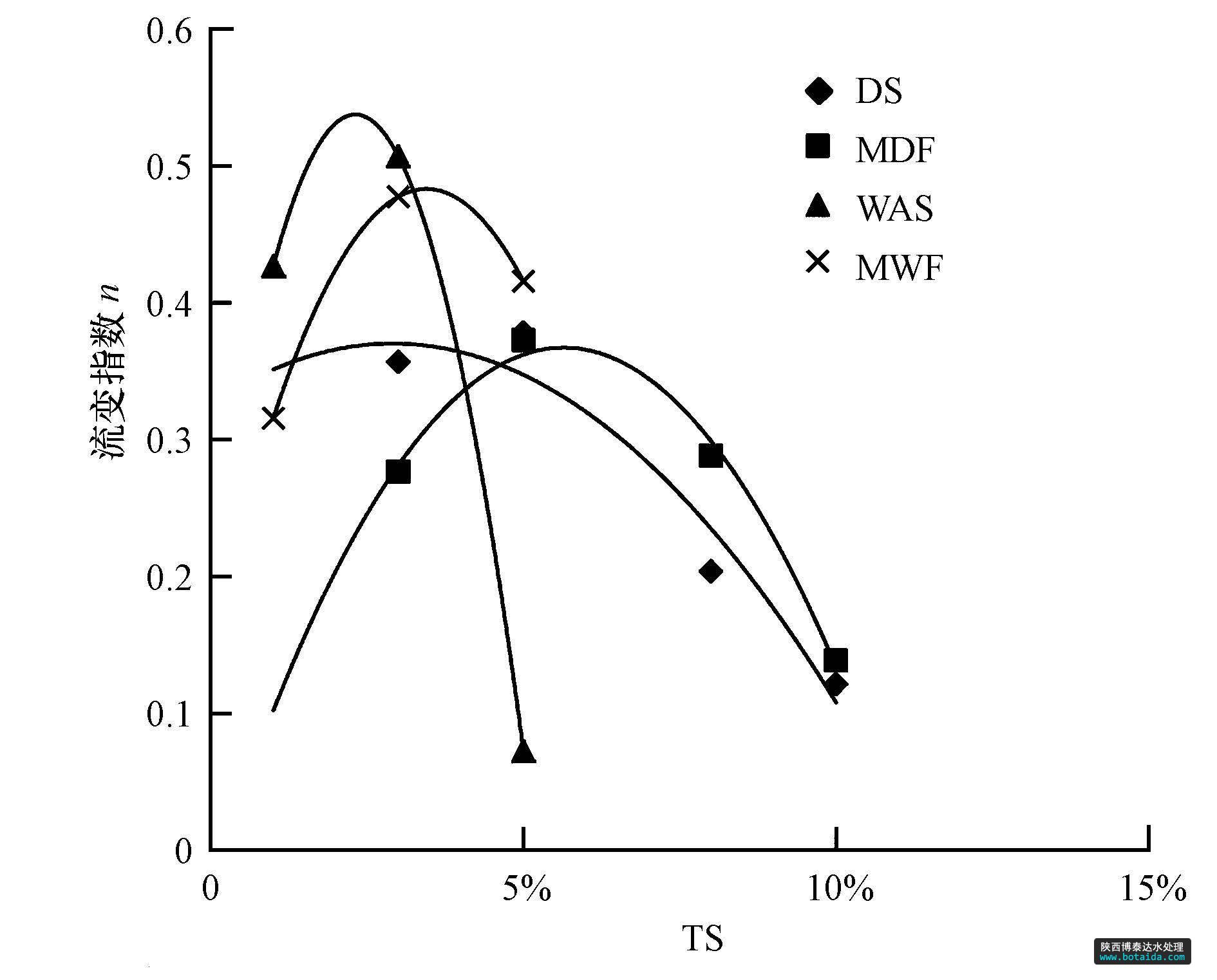 2)隨著固體濃度由1%升高到10%,4種厭氧消化原料的流變指數呈先升高后降低的趨勢,WAS和MDF在TS=3%時流變指數最大,而DS和MDF在TS=5%時流變指數最大.