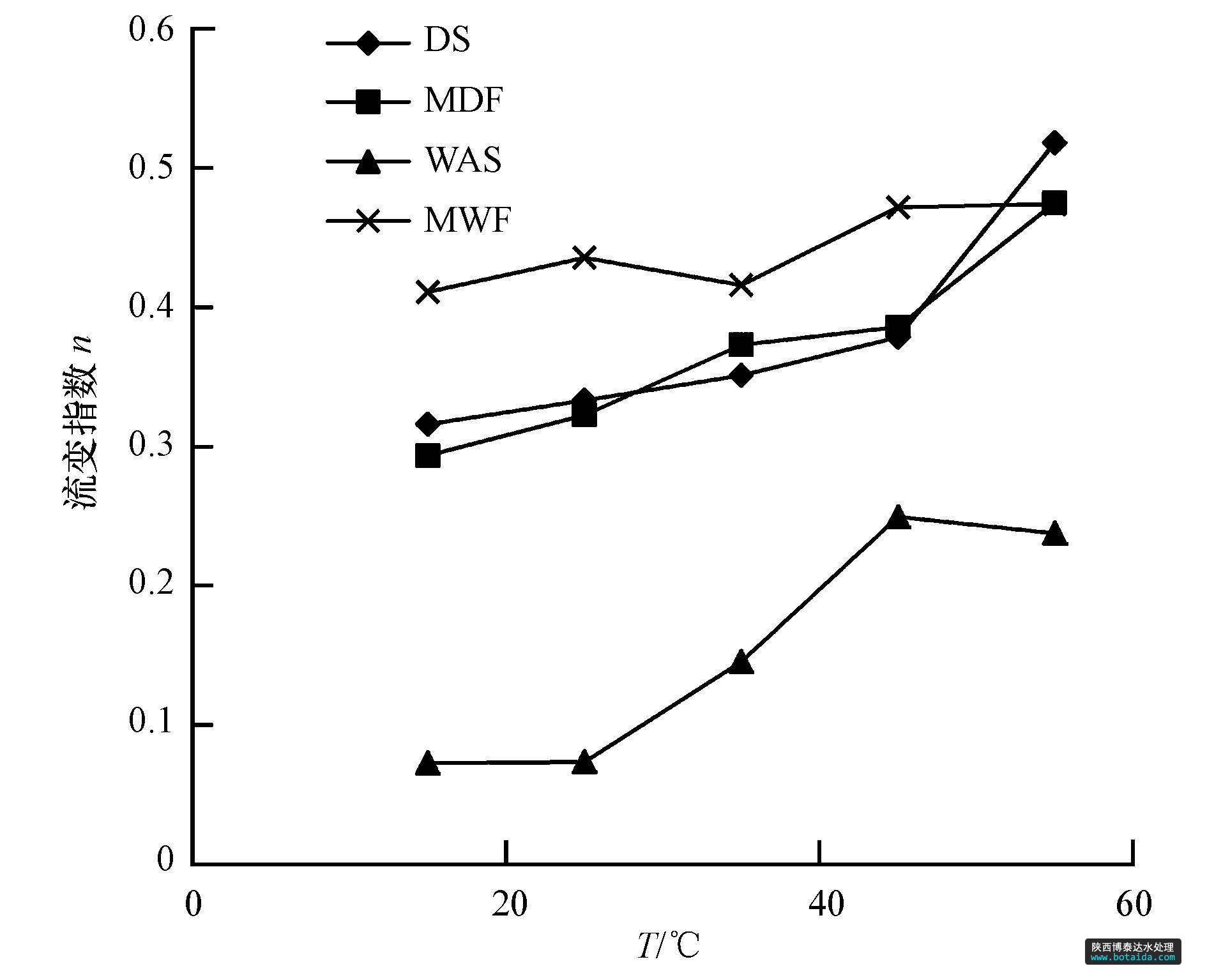 TS為5%時4種原料流變指數隨溫度的變化情況如圖 5所示.由圖 5可以看出4種原料的流變指數隨著溫度的升高而增大.這說明溫度越高,這4種原料的流變性質越接近牛頓流體.在這4種原料中,可以明顯的看出WAS的流變指數最小,偏離牛頓流體的程度最大;MWF的流變指數最大,最趨向于牛頓流體.通過對原始餐廚垃圾的流變特性分析,含水率為81.54%的未稀釋餐廚的黏度為1814 mPa · s,流變指數為0.6177,流變指數大于本文所研究的4種原料的任何1種;可能是餐廚垃圾較純污泥更趨向于牛頓流體,餐廚垃圾的加入導致污泥流變特性的改變,使得混合液較純泥更趨向于牛頓流體.DS的流變指數升高的幅度較大,其余3種原料升高的幅度較小.這說明相對于其他3種原料,DS的黏度對溫度變化更敏感。