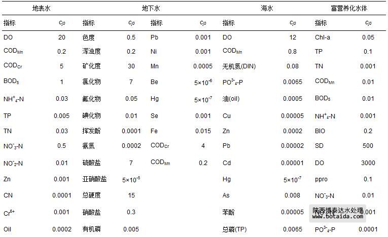 式(2)~(7)中,cj為指標(biāo)j的實(shí)測(cè)值或標(biāo)準(zhǔn)值;cj0為設(shè)定的指標(biāo)j的參照值,4類水體95項(xiàng)指標(biāo)的參照值cj0和室內(nèi)、外空氣29項(xiàng)指標(biāo)的參照值cj0分別如表 1和表 2所示.