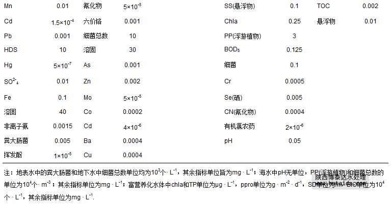 依照國(guó)家制訂的地表水環(huán)境質(zhì)量標(biāo)準(zhǔn)(GB3838— 2002)、地下水環(huán)境質(zhì)量標(biāo)準(zhǔn)(GB/14848—1993)、海水環(huán)境質(zhì)量標(biāo)準(zhǔn)(GB3097—1997)、適用于我國(guó)湖庫(kù)水體的富營(yíng)養(yǎng)化標(biāo)準(zhǔn)及室外空氣環(huán)境質(zhì)量標(biāo)準(zhǔn)(GB3095—1996)和室內(nèi)空氣質(zhì)量標(biāo)準(zhǔn)(GB/T18883—2002),分別選取了4類水體的95項(xiàng)指標(biāo)(其中,地表水、地下水、海水和富營(yíng)養(yǎng)化水體分別有24項(xiàng)、33項(xiàng)、23項(xiàng)和15項(xiàng)指標(biāo))和空氣的29項(xiàng)指標(biāo)(其中,室內(nèi)空氣15項(xiàng)指標(biāo)和室外空氣7項(xiàng)指標(biāo)的年、日2種不同分級(jí)標(biāo)準(zhǔn)情形)作為水環(huán)境和空氣環(huán)境的評(píng)價(jià)指標(biāo)體系.