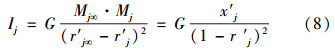 式中,Mj和Mj∞分別為指標(biāo)j的樣本“規(guī)范質(zhì)量”和“參照級(jí)”樣本“規(guī)范質(zhì)量”;r′j為指標(biāo)j的樣本的“規(guī)范坐標(biāo)”,顯然r′j=x′j;G為環(huán)境質(zhì)量引力常數(shù),其取值大小只是為了控制指數(shù)Ij的尺度范圍,對(duì)評(píng)價(jià)結(jié)果無(wú)任何影響,為簡(jiǎn)單起見(jiàn),在此取G=1.從而式(8)可表示為: