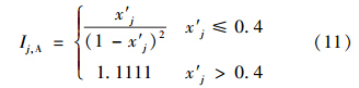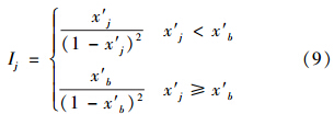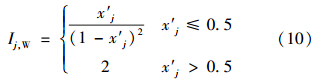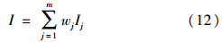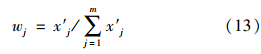 式中,Ij為由式(10)或式(11)計(jì)算得到的指標(biāo)j的引力指數(shù)值;wj為指標(biāo)j的歸一化權(quán)值,即滿足∑ m j=1 wj=1,它可以視實(shí)際問(wèn)題需要,采用某種方法確定.一般情況下,只要各指標(biāo)的規(guī)范值x′j差異不大,可視各指標(biāo)為等權(quán)即可;但若最大指標(biāo)規(guī)范值x′j,max與最小指標(biāo)規(guī)范值x′j,min差異較大,則可采用如式(13)所示的對(duì)各指標(biāo)規(guī)范值x′j的線性加權(quán)計(jì)算權(quán)值.