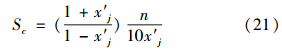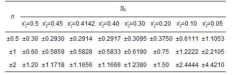 若n固定,將Sc對(duì)x′j求導(dǎo),并令S′c=0,得x′j=-1≈0.4142時(shí),Sc有極小值0.5828n.由于變換式(2)~(7)中,對(duì)多數(shù)指標(biāo)只取n=±2、±1、±0.5.而公式(10)和式(11)中,x′j 取值范圍為x′j∈[0,0.5](對(duì)水體),x′j∈[0,0.4](對(duì)空氣).當(dāng)n為上述值時(shí),x′j 分別取為如表 4所示值時(shí),由式(21)計(jì)算得靈敏度Sc值如表 4所示.