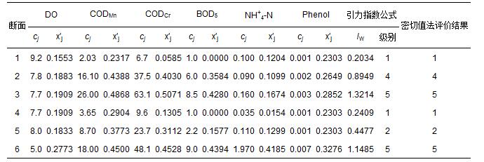 2008年圖們江干流6個(gè)斷面的6項(xiàng)地表水水質(zhì)指標(biāo)監(jiān)測(cè)數(shù)據(jù)cj(唐立新等,2010),以及由式(1)和式(2)計(jì)算得到的指標(biāo)規(guī)范值x′j如表 5所示.對(duì)斷面2和3,采用式(13)對(duì)引力指數(shù)值進(jìn)行加權(quán)計(jì)算;其余斷面在視指標(biāo)為等權(quán)的情況下,用式(10)和式(12)計(jì)算得到各監(jiān)測(cè)點(diǎn)水質(zhì)引力綜合指數(shù)值,并根據(jù)表 3中3類陸地水體的引力綜合指數(shù)值的分級(jí)標(biāo)準(zhǔn)做出水質(zhì)類別判斷結(jié)果(表 5).表 5中還列出了參考文獻(xiàn)(唐立新等,2010)中用密切值法作出的評(píng)價(jià)結(jié)果.可以看出,利用引力普適指數(shù)公式和用密切值法對(duì)6個(gè)斷面水質(zhì)做出的評(píng)價(jià)結(jié)果,完全一致.