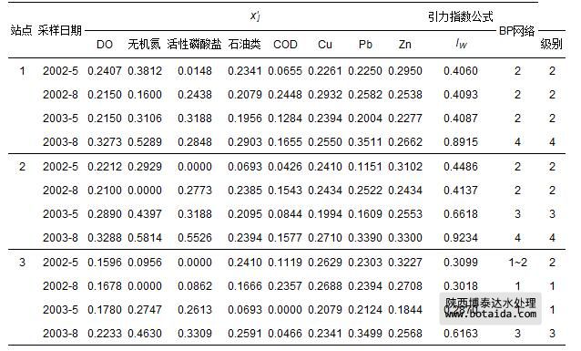 珠江口2002—2003年3個(gè)站點(diǎn)8項(xiàng)海水指標(biāo)監(jiān)測(cè)數(shù)據(jù)cj(李占東等,2005)如表 7所示.由式(1)和式(4)計(jì)算出的指標(biāo)規(guī)范值x′j如表 8所示.由于站點(diǎn)1的2003-8和站點(diǎn)2的2002-5,2002-8和2003-5樣本不同指標(biāo)的規(guī)范值x′j相差較大,因而需用式(13)對(duì)引力指數(shù)值進(jìn)行加權(quán)計(jì)算外.其余日期采樣點(diǎn)則視各指標(biāo)為等權(quán),再用式(10)和式(12)計(jì)算得到各站點(diǎn)海水水質(zhì)引力綜合指數(shù)值,并根據(jù)表 3中海水水質(zhì)引力指數(shù)分級(jí)標(biāo)準(zhǔn)做出評(píng)價(jià)結(jié)果(表 8).表中還列出文獻(xiàn)(李占東等,2005)中用BP人工神經(jīng)網(wǎng)絡(luò)評(píng)價(jià)法做出的評(píng)價(jià)結(jié)果.可以看出,全部12個(gè)樣本2種方法的評(píng)價(jià)級(jí)別完全一致.