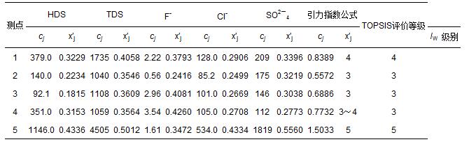 豐縣5個(gè)監(jiān)測(cè)點(diǎn)的5項(xiàng)地下水指標(biāo)監(jiān)測(cè)數(shù)據(jù)cj(劉洪等,2009),以及由式(1)和式(3)計(jì)算得到的指標(biāo)規(guī)范值x′j如表 6所示.在視各指標(biāo)為等權(quán)情況下,用式(10)和式(12)計(jì)算得到各監(jiān)測(cè)點(diǎn)水質(zhì)引力綜合指數(shù)的指數(shù)值,并根據(jù)表 3中3類陸地水體的綜合指數(shù)值分級(jí)標(biāo)準(zhǔn)做出水質(zhì)類別判斷結(jié)果(表 6).表中還列出文獻(xiàn)(劉洪等,2009)中用多屬性決策分析法(TOPSIS)做出的評(píng)價(jià)結(jié)果,可以看出,2種方法做出的評(píng)價(jià)結(jié)果完全一致.