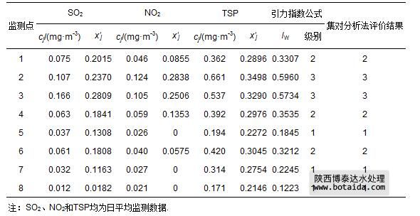 武漢市不同測(cè)點(diǎn)的空氣指標(biāo)日平均濃度監(jiān)測(cè)數(shù)據(jù)cj(郭紹英等,2009),以及由式(1)和式(6)計(jì)算出的指標(biāo)規(guī)范值x′j如表 10所示.在視各指標(biāo)為等權(quán)的情況下,將表 10中的3項(xiàng)指標(biāo)規(guī)范值x′j分別代入式(11)和式(12)所示的引力指數(shù)公式,計(jì)算得到武漢市各測(cè)點(diǎn)空氣質(zhì)量引力綜合指數(shù)值,并根據(jù)表 3中空氣環(huán)境質(zhì)量綜合指數(shù)值分級(jí)標(biāo)準(zhǔn)作出的判斷結(jié)果(表 10).表中還列出了參考文獻(xiàn)(郭紹英等,2009)中用集對(duì)分析法作出的評(píng)價(jià)結(jié)果.可以看出,引力指數(shù)公式評(píng)價(jià)結(jié)果與集對(duì)分析評(píng)價(jià)結(jié)果完全一致.