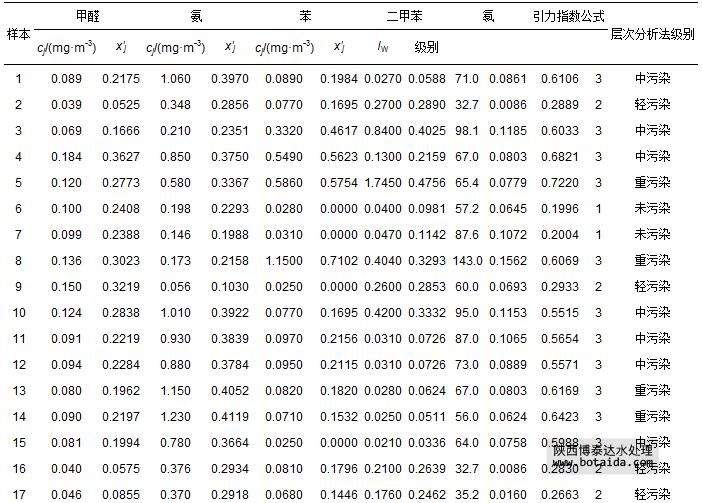 2002年11—12月長(zhǎng)春市30個(gè)室內(nèi)樣本5項(xiàng)指標(biāo)監(jiān)測(cè)數(shù)據(jù)cj(湯紅巖等,2005),以及由式(1)和式(7)計(jì)算出的指標(biāo)規(guī)范值x′j如表 11所示.由于樣本1、11~15、26和27的不同指標(biāo)計(jì)算得到的規(guī)范值相差較大,因此,在用式(12)計(jì)算引力綜合指數(shù)時(shí),需用式(13)對(duì)引力指數(shù)值進(jìn)行加權(quán)計(jì)算,其余22個(gè)樣本的指標(biāo)視作等權(quán),計(jì)算得到各樣本引力綜合指數(shù)值,并根據(jù)表 3中空氣環(huán)境質(zhì)量引力指數(shù)分級(jí)標(biāo)準(zhǔn)做出評(píng)價(jià)結(jié)果(表 11).表中還列出文獻(xiàn)(湯紅巖等,2005)中用層次分析評(píng)價(jià)法做出的評(píng)價(jià)結(jié)果.由于文獻(xiàn)(湯紅巖等,2005)中的層次分析評(píng)價(jià)法將室內(nèi)空氣污染劃分為清潔(1*級(jí))、未污染(2*級(jí))、輕污染(3*級(jí))、中污染(4*級(jí))和重污染(5*級(jí))等5級(jí);而本文引力指數(shù)法將其劃分為1級(jí)、2級(jí)、3級(jí).二者對(duì)應(yīng)關(guān)系為:(1*級(jí)清潔、2*級(jí)未污染)對(duì)應(yīng)1級(jí),(3*級(jí)輕污染)對(duì)應(yīng)2級(jí),(4*級(jí)中污染、5*級(jí)重污染)對(duì)應(yīng)3級(jí).由表 11可以看出,二種方法評(píng)價(jià)結(jié)果完全一致.