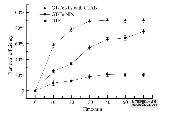 圖 5 GTE、GTE合成Fe NPs和CTAB存在時GTE合成的Fe NPs 對MG的去除