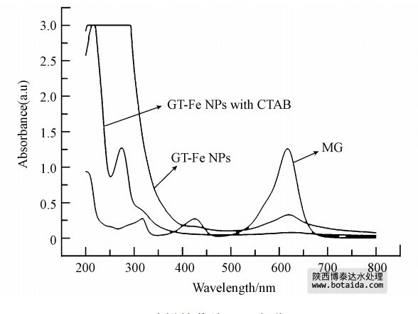 降解反應(yīng)在離心管中進行,反應(yīng)溫度為298 K,分別移取2 mL GTE合成的Fe NPs懸濁液和CTAB作用下合成的Fe NPs懸濁液至7支離心管中,分別向每個離心管中移入8 mL(50 mg · L-1)的MG溶液,在搖床中分別振蕩0、10、20、30、40、50、60 min取樣,反應(yīng)液在10000 r · min-1下離心5 min,上清液用紫外可見分光光度計于617 nm處測定溶液吸光度,用MG的去除率來評價和比較GTE合成的Fe NPs和CTAB作用下GTE合成的Fe NPs的性能.