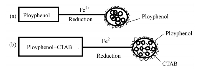 用植物提取液合成納米金屬主要是通過植物提取液中的有機成分如多酚等為還原劑還原金屬鹽,GTE中多酚可作為還原劑還原亞鐵鹽制備Fe NPs(Njagi et al., 2011; Shahwan et al., 2011; Kharissova et al., 2013; Mittal et al., 2013). GTE合成Fe NPs和CTAB作用下GTE合成Fe NPs可能的機理如圖 6所示. 陽離子表面活性劑CTAB存在時,由于CTAB吸附在納米顆粒表面導(dǎo)致納米鐵帶電荷,納米顆粒之間的斥力作用使得合成的納米顆粒更加分散,從SEM、XRD、FTIR和UV-vis等的表征結(jié)果也可證實CTAB的包覆使得合成的納米鐵更加穩(wěn)定.