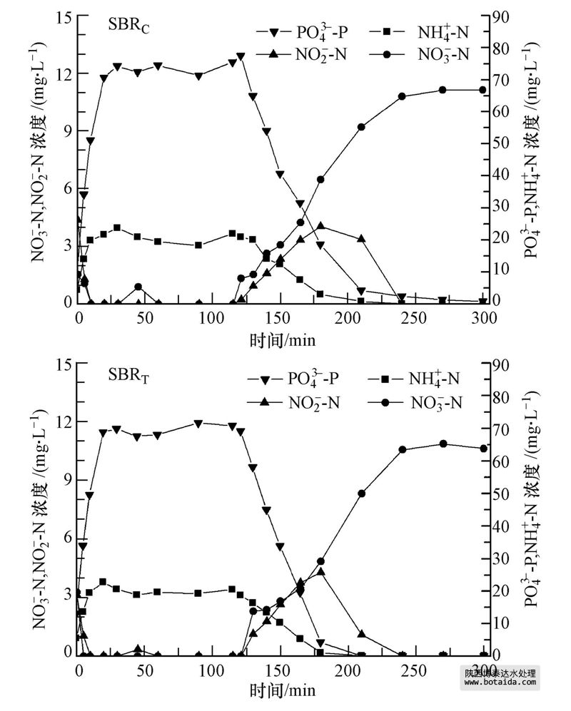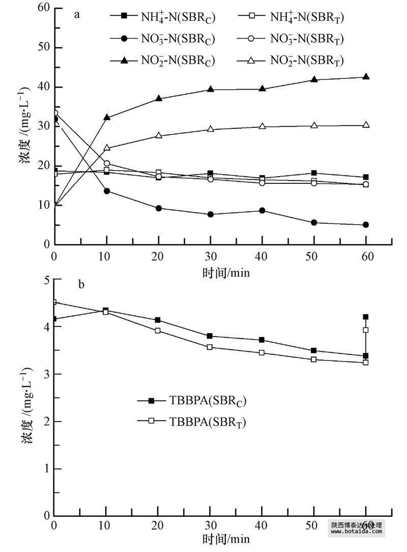 兩套SBR反應(yīng)器穩(wěn)定運(yùn)行狀態(tài)下,出水乙酸鈉和亞硝酸鹽濃度低于檢測方法的檢出限,出水PO3-4-P,NH+4-N濃度均小于0.5 mg · L-1,反應(yīng)器具有良好的脫氮除磷功能;SBRC反應(yīng)器出水NO-3-N濃度為(12.9±2.2)mg · L-1,SBRT反應(yīng)器出水NO-3-N濃度為(15.3±2.0)mg · L-1.表明TBBPA對SBR反應(yīng)器硝化和除磷效率沒有太大影響,但對出水硝態(tài)氮濃度略有影響.