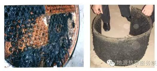 1)防堵塞。未處理原生污水中含有大尺度懸浮物,包括纖維狀的發(fā)絲類、紙屑類、藻狀類,普通的換熱設(shè)備是根本無法承受的。而實(shí)踐證明:已處理污水和地表水中的懸浮物含量相對較少,盡管與未處理原水不在同一數(shù)量級,但隨著運(yùn)行時(shí)間增長,堵塞問題也立即突現(xiàn),原水的堵塞時(shí)間為1~3d,而地表水則為7~10d。圖4是未處理原生污水的堵塞現(xiàn)象,圖5是已處理污水的堵塞狀況。
