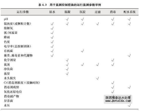 運(yùn)行監(jiān)測(cè)包括參數(shù)測(cè)量或者觀測(cè)活動(dòng)。所選定的運(yùn)行監(jiān)測(cè)參數(shù)應(yīng)能反映每步控制措施 的有效性,能及時(shí)指示運(yùn)行情況,并能很快地被測(cè)量,能及時(shí)采取適當(dāng)?shù)膽?yīng)對(duì)措施。像一些 可測(cè)量的變量,如余氯、 pH和渾濁度,或可觀察到的因子,諸如防蟲(chóng)網(wǎng)的完整性。 腸道病原體和指示生物在運(yùn)行監(jiān)測(cè)中應(yīng)用有限,因?yàn)樘幚砗头治鏊畼铀钑r(shí)間太長(zhǎng),來(lái) 不及在供水之前對(duì)操作做出調(diào)整。