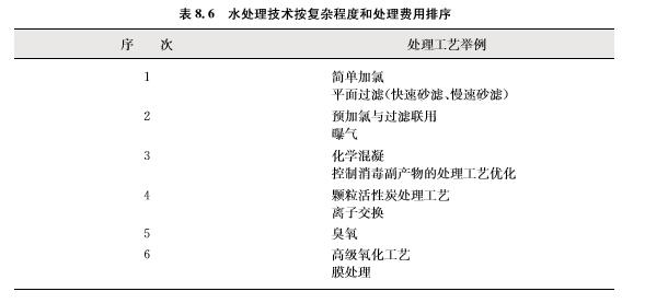 ?        不同水處理工藝按其復雜程度和處理費用的定性排序如表8.6所示,次序越高,工藝或 運營越復雜。