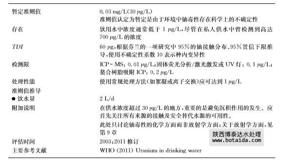 根據(jù)人群接觸高濃度鈾的新的流行病學(xué)研究推導(dǎo)的30μg /L的暫定準(zhǔn)則值,代替原先 根據(jù)實驗動物研究推導(dǎo)的暫定準(zhǔn)則值。被認定為是基于有關(guān)鈾的毒理學(xué)和流行病學(xué)上的不 確定性以及要實現(xiàn)更低濃度供應(yīng)在技術(shù)上的困難度。要注意的是,有關(guān)人類群體的研究如 可獲取且質(zhì)優(yōu),則為用于推導(dǎo)健康準(zhǔn)則值相關(guān)信息的首選來源