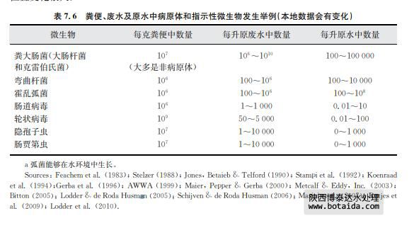表7.6中,可以清楚地看到糞便指示菌,如大腸桿菌在廢水中常常呈現(xiàn)較高濃度。每個 人都會散布大腸桿菌,但濃度變化很大。只有被感染的人散布病原體,因此,廢水中病原體 濃度變化更大。這樣的變化取決于擴(kuò)散模式,也依賴于其他因素,如排放廢水的人群規(guī)?;?被其他廢水、如工業(yè)廢水稀釋的規(guī)模。傳統(tǒng)廢水處理在廢水被排放到地表水之前,常常降低 一到兩個數(shù)量級的微生物濃度。在其他地方,原水被直接排放,或者通過排水管溢流偶爾排 放。排放廢水被受納水體稀釋,從而減少了病原體數(shù)量,稀釋因子是因地而異。病原體失 活、死亡或進(jìn)入到沉積物里也會使病原體減少。這些因子隨著表面水體和氣候的不同而變 化。這種變化說明糞便指示菌和病原體的濃度在地表水體比廢水中變化更多。