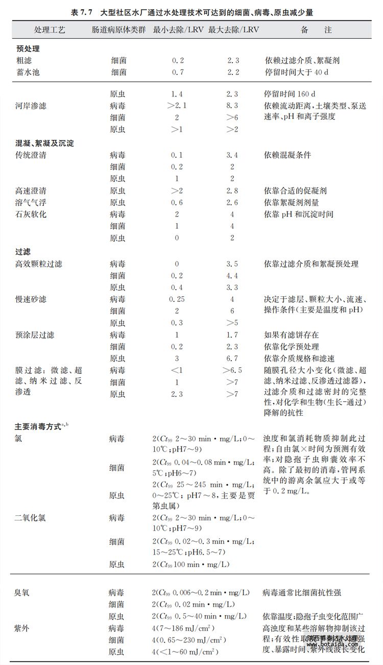 表7.7中列出的微生物降低水平是指微生物的大類群或類別:細(xì)菌、病毒和原蟲。由 于各種微生物本身所固有的特性(如大小、外保護(hù)層特性和表面理化性質(zhì)等)不同,因而不同 種類的微生物的處理效果往往存在差異。在這些微生物類群中,處理效果在特定的種、型、 株間差別較小。但這種差別確實(shí)存在,表中針對各類群微生物中抵抗力強(qiáng)、存活時(shí)間久的病 原體列出了去除的保守估計(jì)。若某一微生物類群中不同的病原體在處理后下降值差別較大 時(shí),則在表中單獨(dú)列出針對相應(yīng)病原體的處理結(jié)果。