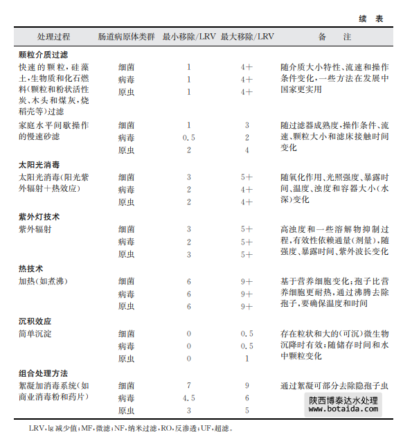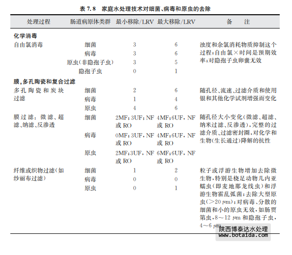 表7.8總結了采用上述幾種家庭水處理技術對水傳播細菌、病毒和寄生性原生蟲的 去除情況。這些去除信息是基于科學文獻報告的研究結果。有兩個有效性內容:基本去 除和最大去除。基本去除是指由相對不熟練人員實際操作時的一般運行效果,且操作人 員將以上方法用于處理平均水質或可變水質原水及現(xiàn)場只有很少應用工具以優(yōu)化處理條 件和操作時。最大去除是指在熟練操作和優(yōu)化運行條件下,并且在可預見和不變水質條 件下,有相關儀器工具支持并保持最高水平運行時達到的效果(如測試一個已知濃度和種 屬的微生物時)。應當該注意的是某些水處理工藝的lg減少值存在差異,如表7.8中的 家庭水處理和表7.7中的集中處理。這種相同處理技術、不同的運行效果差異是可以理 解的。因為集中處理所用水通常滿足處理工藝所需要的質量,而且處理過程由訓練有素的操作人員使用,工藝經過合理的設計并有良好的運行控制系統(tǒng)。相反,家庭水處理通常 水質變化較大,也沒有得到最好的運行技術優(yōu)化。相對于管理集中處理設施的人員,處理 過程也常常得不到專業(yè)人員的專業(yè)運行控制。這些處理過程的進一步細節(jié),包括運行影 響因子和表7.8中提供的lg減少值水平基礎,可見附錄1支持性文件《家庭水管理和家庭 水處理選擇評估》。陜西博泰達水處理為您提供服務。