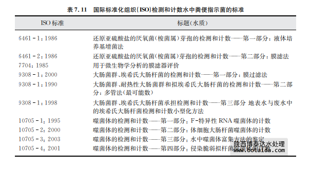 國際標準方法在被采納之前應(yīng)根據(jù)當?shù)氐木唧w情況進行評估??梢允褂靡呀⒌臉藴?方法,如國際標準化組織(ISO)(見表7.11)的方法或效果及可靠性與其相當?shù)姆椒ň刹?用。對于常規(guī)檢測可采用那些已建立的方法。無論選用何種方法檢測埃希氏大腸桿菌或耐 熱性大腸菌群,都必須考慮因環(huán)境或消毒劑受到損傷的微生物菌株的“復(fù)蘇”或“恢復(fù)”問題。