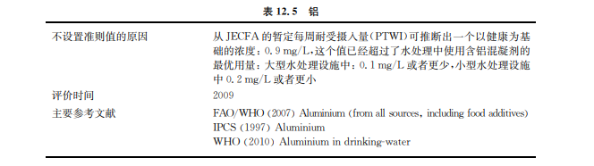 盡管鋁廣泛存在于食物、飲用水及抗酸劑中,很少有跡象表明經(jīng)口攝入鋁會(huì)引起人急性 中毒。有一種假設(shè)認(rèn)為鋁的攝入會(huì)增加人類老年癡呆癥發(fā)病風(fēng)險(xiǎn)。1997年 WHO發(fā)布的 環(huán)境健康標(biāo)準(zhǔn)中對鋁作出規(guī)定(見表12.5)。