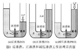 正滲透膜技術屬于膜分離過程。水從高水化學勢區(qū)通過選擇性滲透膜向低水化學勢區(qū)進行轉移。選擇性滲透膜分隔的高水化學勢區(qū)和低水化學勢區(qū)所存在的滲透壓差是正滲透過程的驅動力。正滲透技術具有低能耗、較高的水通量和回收率、不易結垢和可處理高濃鹽水等優(yōu)點。