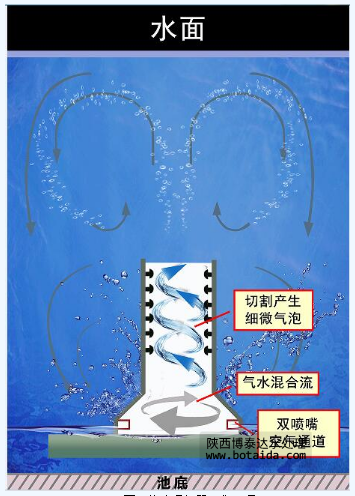 旋流曝氣器在工作過程中,氣體從底部法蘭口進(jìn)入后從緊貼鐘型曲面的 2 個噴嘴噴出形成旋流效果,以極快的速度沿著鐘型壁面向上加速回旋。由于鐘型上側(cè)漸漸狹窄,空氣獲得極大的加速度和沖擊力。 由于氣體作用,混合液在筒內(nèi)、外循環(huán)流動,氣液上升過程中,被筒內(nèi)部結(jié)構(gòu)多次碰撞切割,形成大量超微氣泡,且與周圍的泥水混合物充分混合,增加了氧氣的傳質(zhì)速率和氧利用率;充分混合的氣水猛力向上沖出,強(qiáng)烈的循環(huán)水流使部分小氣泡和水流返回池底,同時使底部淤泥參與循環(huán),因而整個曝氣池內(nèi)無充氧盲區(qū),實現(xiàn)了曝氣池容積利用最大化。(見圖3)