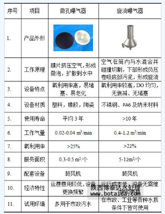 由于兩種曝氣設(shè)備的工作原理、生產(chǎn)材質(zhì)不同,故兩種曝氣器在性能上有很多不同點。具體不同點見表1。