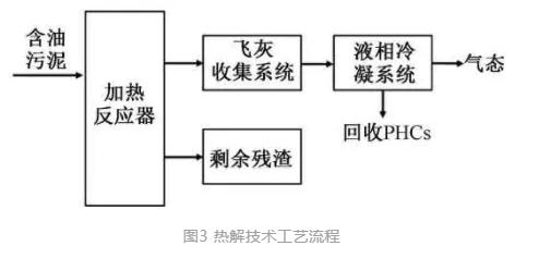 在無(wú)氧條件下,含油污泥經(jīng)高溫?zé)峤廪D(zhuǎn)化為氣、液、固三相,氣相產(chǎn)品以CH4、CO2、H2和CO為主,液相一般為常溫燃油和水,固相殘?jiān)泻薪固浚话阋曰厥找簯B(tài)PHCs為主,可不調(diào)質(zhì)達(dá)到回收目的。熱解反應(yīng)在還原氣氛下進(jìn)行,產(chǎn)二噁英極少,其典型工藝流程如圖3所示。